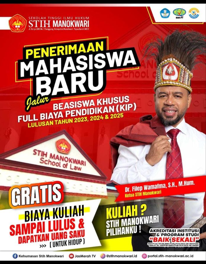 MANOKWARI, JAGAINDONESIA.COM – Sekolah Tinggi Ilmu Hukum (STIH) Manokwari masih terus menerima mahasiswa baru hingga Juli 2025. Peluang kuliah gratis hingga wisuda menjadi pilihan tepat para pemuda/i dimana saja, khususnya bagi pelajar tamatan 2023, 2024 dan 2025.