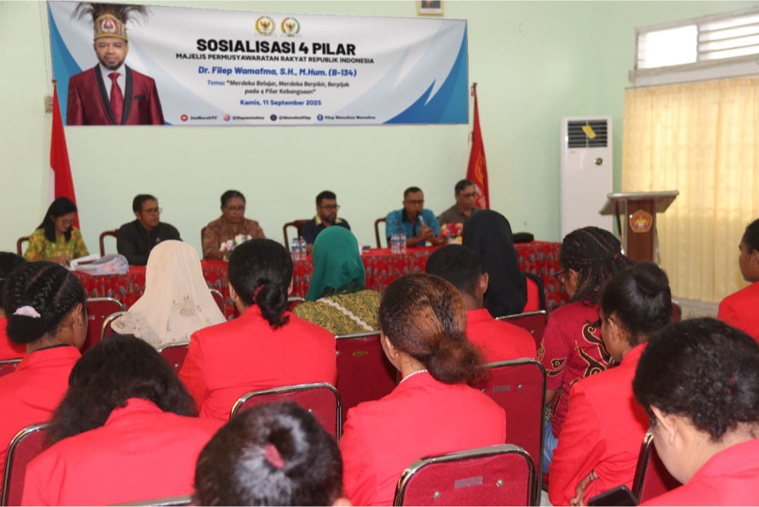 Manokwari, 11 September 2025 — Anggota Dewan Perwakilan Daerah Republik Indonesia (DPD RI) Daerah Pemilihan Papua Barat, Dr. Filep Wamafma, melaksanakan kegiatan Sosialisasi Empat Pilar MPR RI yang dihadiri oleh mahasiswa dan civitas akademika Sekolah Tinggi Ilmu Hukum (STIH) Manokwari. Kegiatan ini dilangsungkan pada Kamis, 11 September 2025, bertempat di Aula STIH Manokwari, Jalan Karya Abri No.2, Sanggeng, Manokwari Barat.