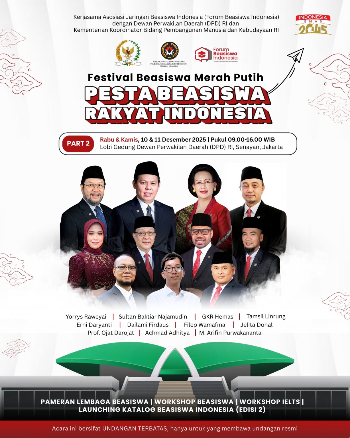 JAKARTA, JAGAINDONESIA.COM – Dewan Perwakilan Daerah (DPD) RI mengadakan Festival Beasiswa Merah Putih yang menjadi ajang pesta beasiswa rakyat Indonesia yang berlangsung selama dua hari berturut-turut, 10-11 Desember 2025. Kegiatan yang berjalan atas kolaborasi dengan Kementerian Koordinator Bidang Pembangunan Manusia dan Kebudayaan RI dan Asosiasi Jaringan Beasiswa Indonesia ini menghadirkan banyak penyedia beasiswa baik dalam maupun luar negeri.