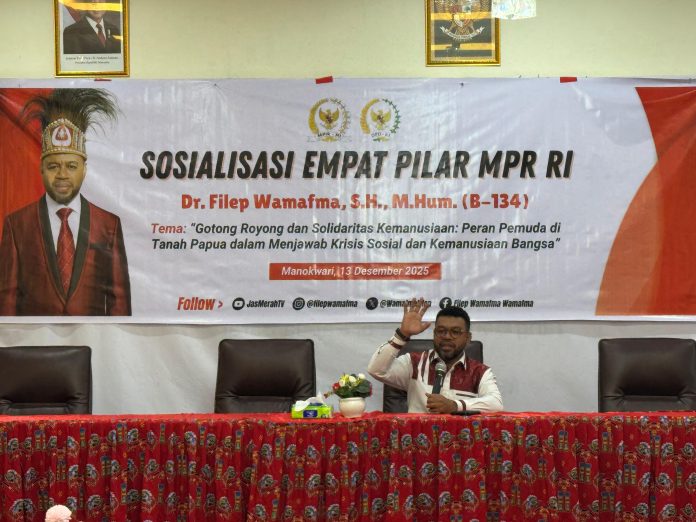 Manokwari — Senator Papua Barat, Dr. Filep Wamafma, menggelar kegiatan Sosialisasi Empat Pilar MPR RI bersama mahasiswa di Kampus Sekolah Tinggi Ilmu Hukum (STIH) Manokwari, Jalan Karya Abri No. 2, Sanggeng, Kecamatan Manokwari Barat, Kabupaten Manokwari, pada 13 Desember 2025.
