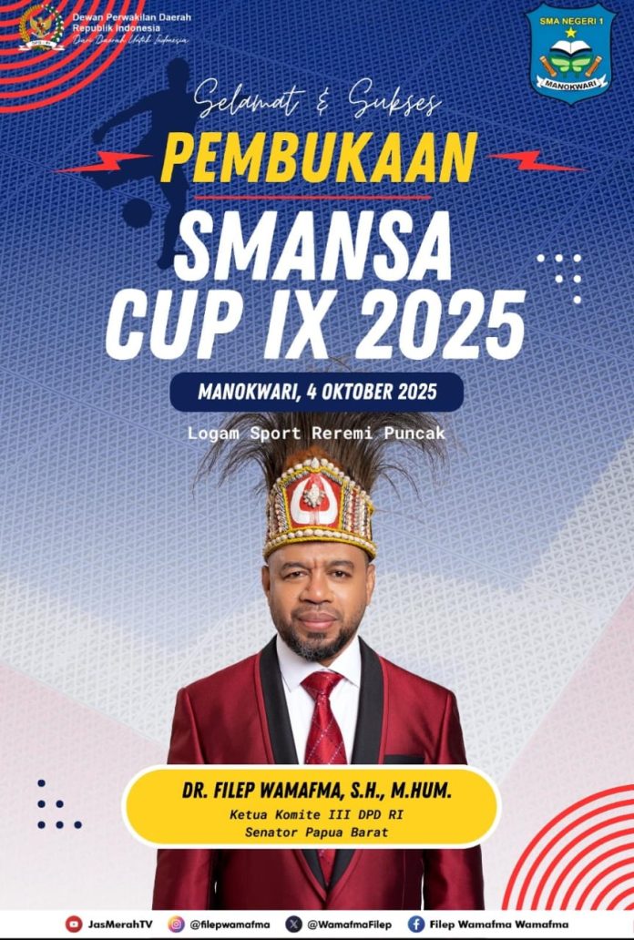 MANOKWARI, JAGAINDONESIA.COM – Senator Papua Barat, Dr. Filep Wamafma, S.H. ,M.Hum turut berpartisipasi mendukung dan menyukseskan SMAnsa Cup ke-9 Tahun 2025. Kegiatan yang menjadi ajang pertemuan alumni SMA Negeri 1 Manokwari ini berlangsung di lapangan Logam Futsal Reremi Manokwari, 4-18 Oktober 2025.